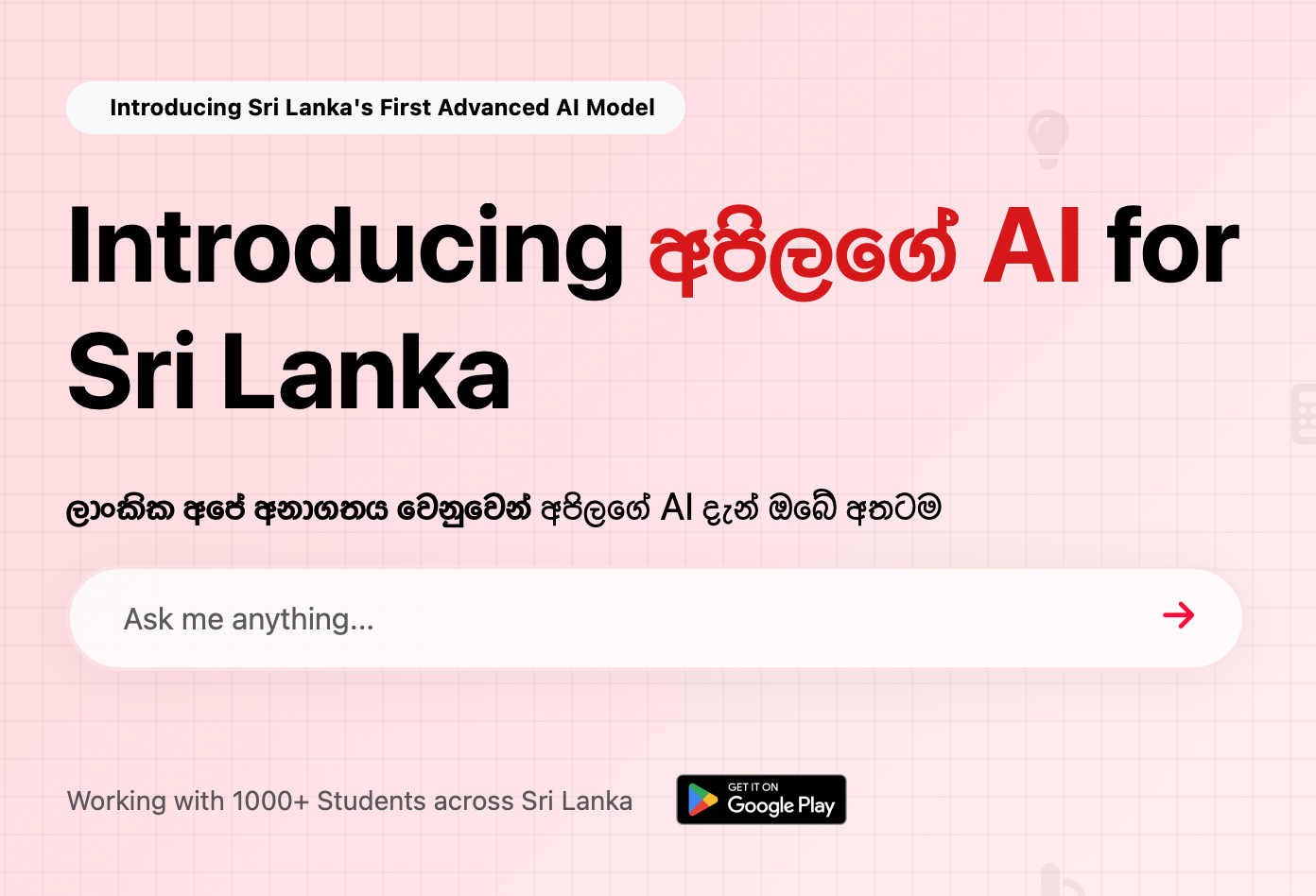 Apilage AI is a Sri Lankan artificial intelligence platform designed to provide Sinhala-based educational assistance, study tools, and smart search solutions for students and learners.