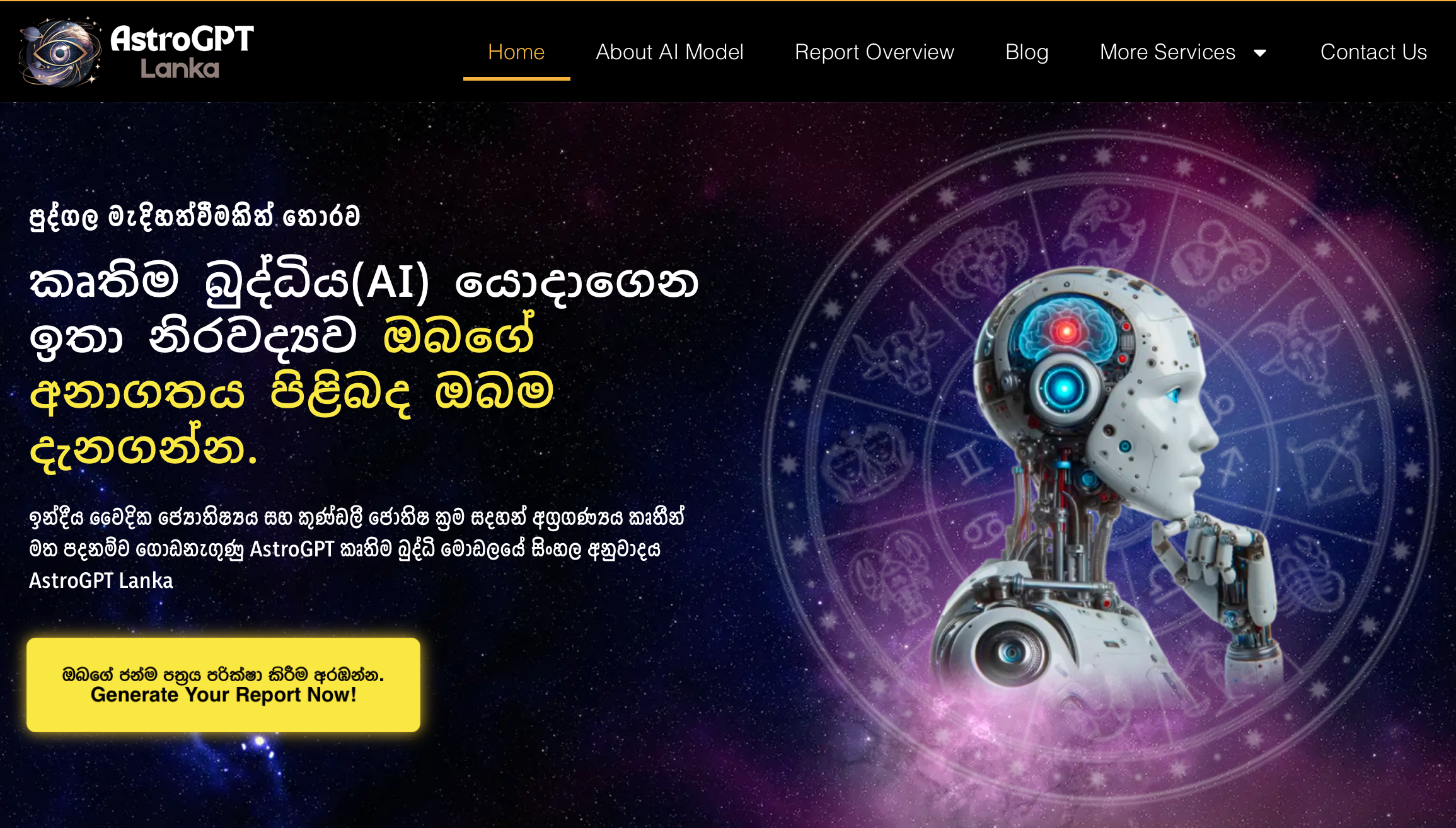 AstroGPT කෘතිම බුද්ධිය(AI) යොදාගෙන ඉතා නිරවද්යව ඔබගේ අනාගතය පිළිබද ඔබම දැනගන්න. ඉන්දීය වෛදික ජ්යෝතිෂ්යය සහ කුණ්ඩලී ජෝතිෂ ක්රම සදහන් අග්රගණ්යය කෘතීන් මත පදනම්ව ගොඩනැගුණු AstroGPT කෘතිම බුද්ධි මොඩලයේ සිංහල අනුවාදය.